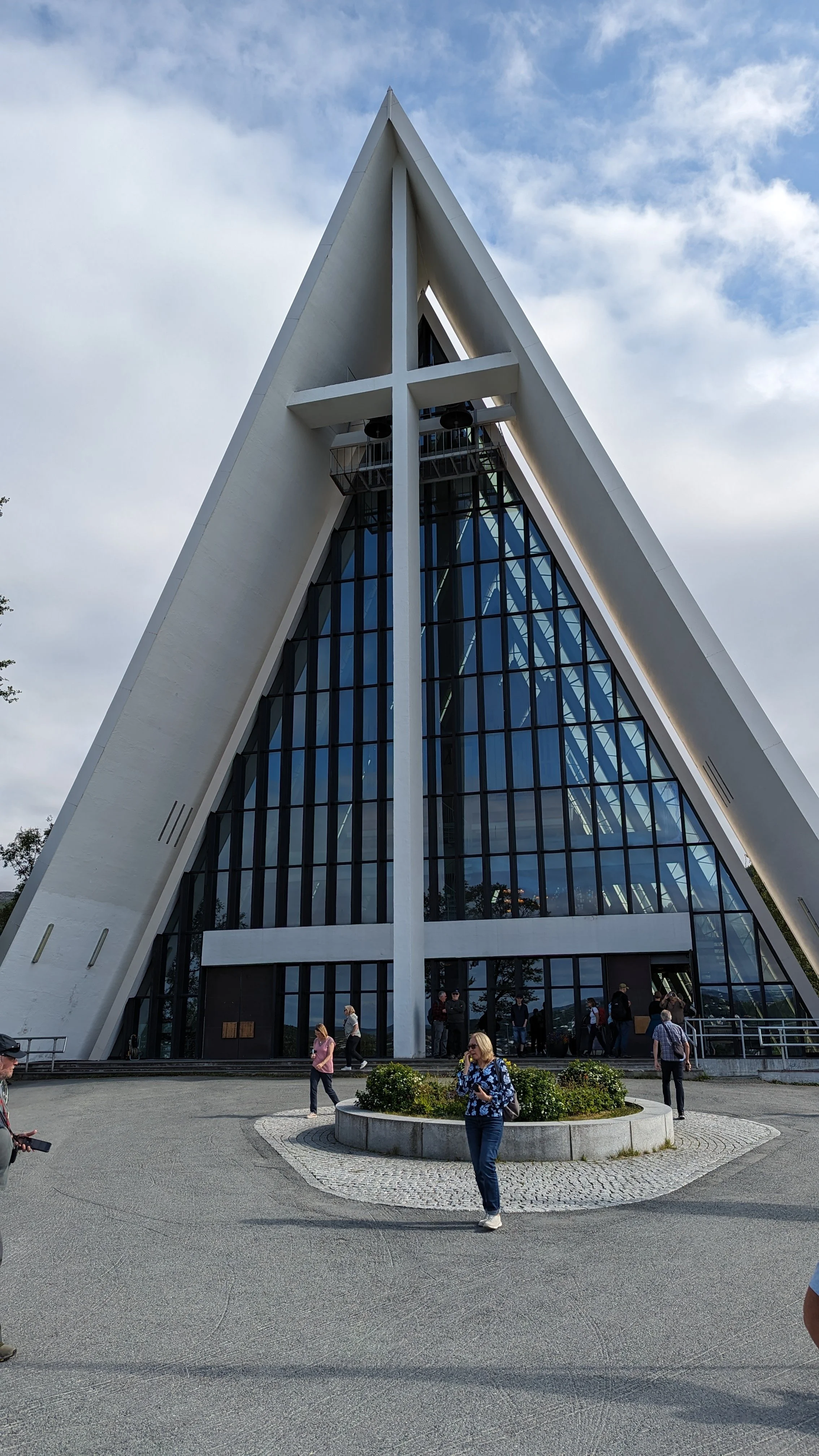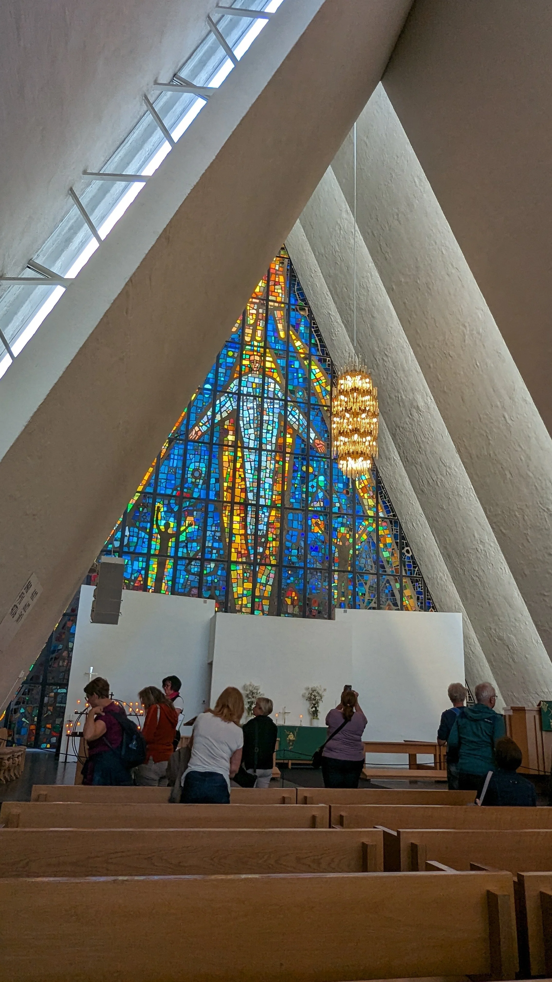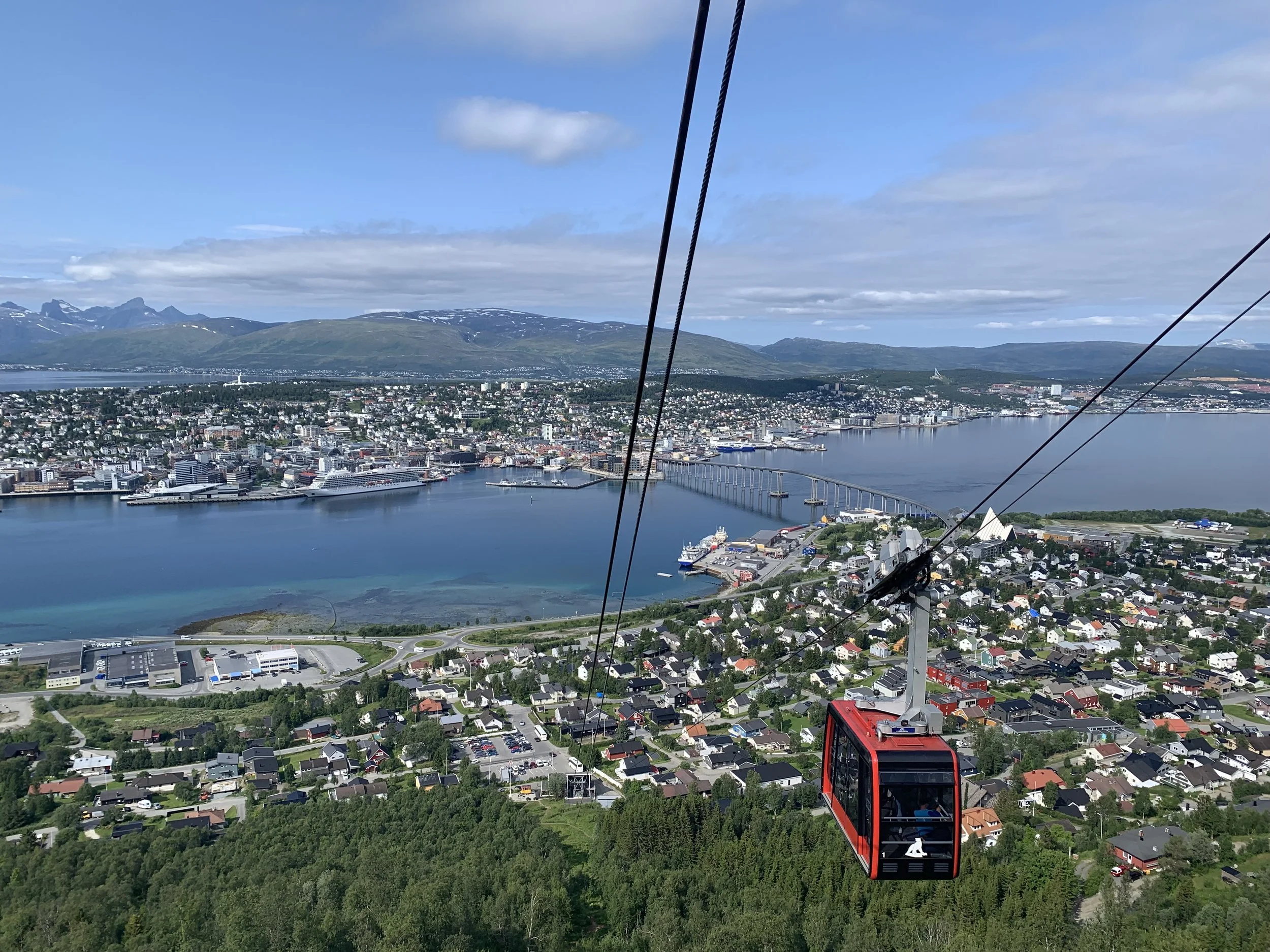 Today we had a leisurely morning with an afternoon excursion scheduled. We started the day by taking a tram to the top of the hill, Storsteinen, above Tromsø. It was a wonderful view, and we watched a paraglider guy fly off the top of the hill. There were many families enjoying the beautiful day. We descended the hill and went to the Arctic Cathedral. The cathedral had an interesting stained glass window with many interesting symbols. After the cathedral we went to the Polar Museum. Most of the signage was in Norwegian and I was very tired, so I waited outside most of the tour and listened via the Quiet Vox ear piece! Shelly managed to see all of it!